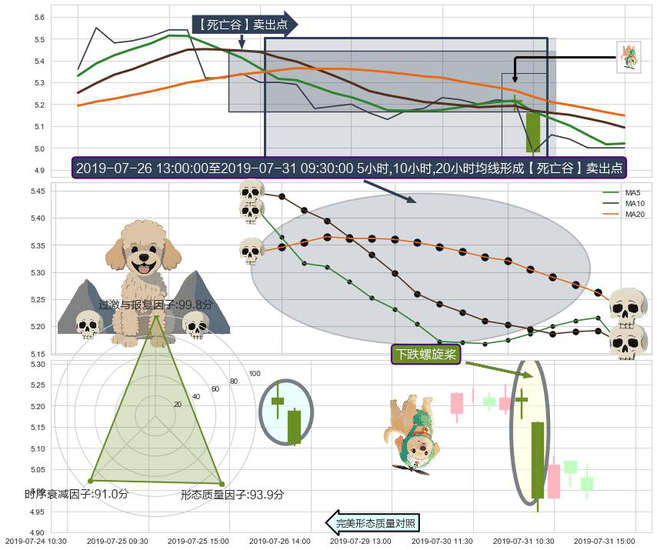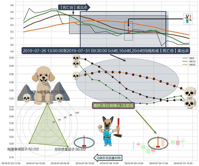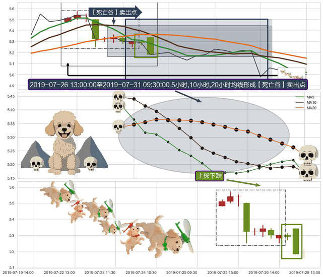➣ 2019-07-26 14:00:00-小时至2019-07-31 09:30:00-小时显现 5小时-10小时-20小时均线 【死亡谷】卖出点 看空信号,后市看跌,卖出