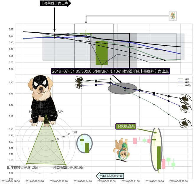 ➣ 下跌螺旋桨 + 【毒蜘蛛】卖出点毒蜘蛛均线交叉卖出点信号叠加后【信号初始稳固度】极低,【看空】信号叠加【可信度影响极小】