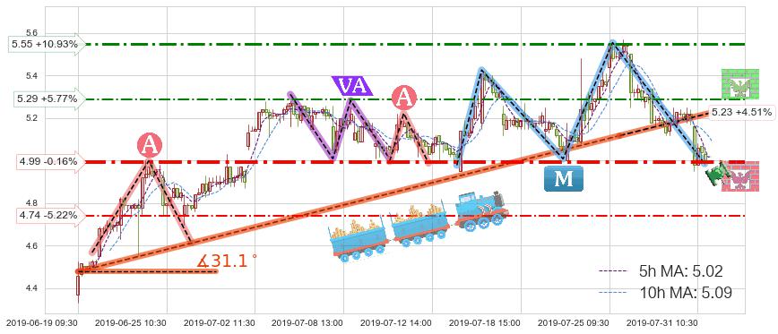 ♘ 阻力价格位5.29,可信任强度48.38%,距离最后交易2019-07-31 15:00形成的收盘价格5.00相差 +5.77%