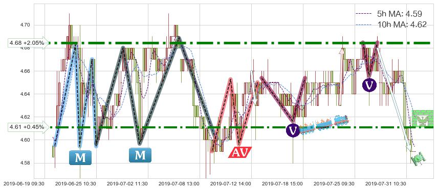 ♘ 阻力价格位4.61,可信任强度76.49%,距离最后交易2019-07-31 15:00形成的收盘价格4.59相差 +0.45%