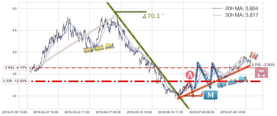♘ 支撑价格位3.642,可信任强度42.98%,距离最后交易2019-07-31 15:00形成的收盘价格3.800相差 -4.15%