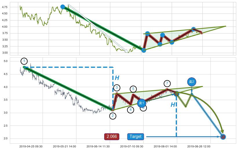 ➢ 升楔型:阻力位【③⑤⑦】不断走高,但对比下边上涨速度慢,构成【楔型】慢线