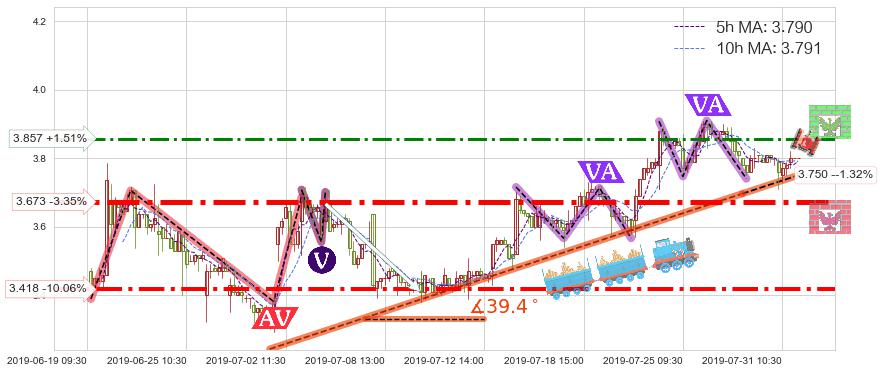 🍖 长线趋势跟踪组合短线均值回复[强支撑信号]2019-06-28 14:00-2019-07-29 13:00上升趋势依然成立(上涨趋势跟踪依然可行),短线价格略微下行回调(均值回复猜想),即将接近趋势提供的未破位的支撑价格:3.750。