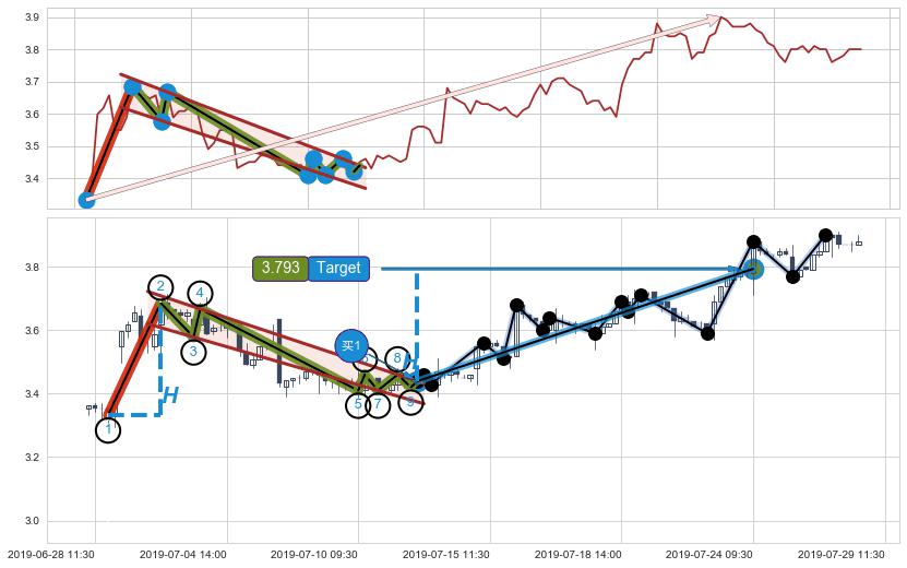 从2019-07-29 14:00至2019-07-31 15:00,共包含14个小时,阶段股价上涨1.07%,阶段股价变动位移路程比: 1 : 4