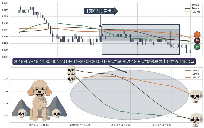 ⚀ 2019-07-16 13:00:00-小时至2019-07-30 09:30:00-小时显现 60小时-90小时-120小时均线 【死亡谷】卖出点 看空信号,后市看跌,卖出