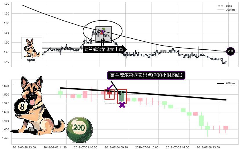⚀ 2019-07-03 15:00:00-小时显现 葛兰威尔均线 200小时均线 第⑧卖出点 下降趋势的中继信号,后市看跌,卖出信号