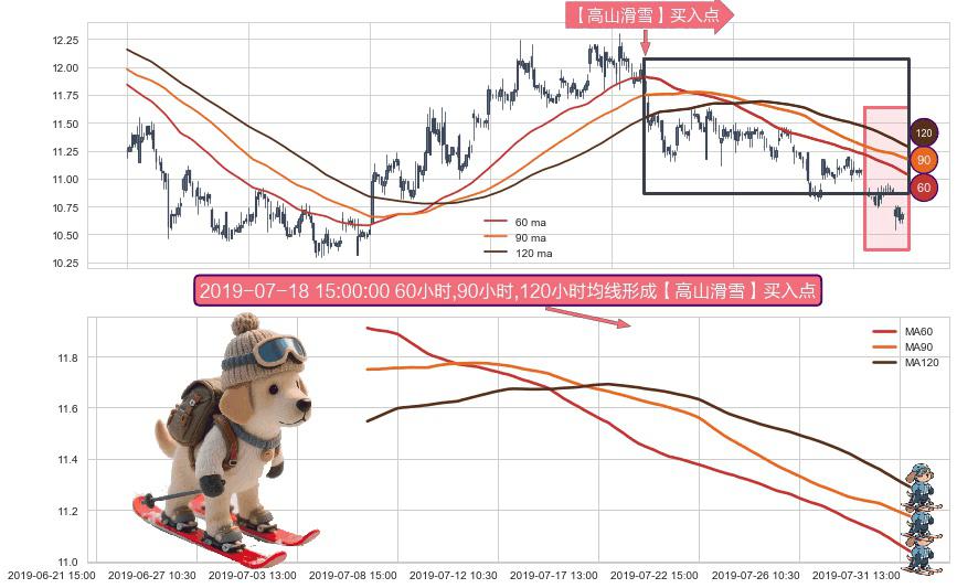 形态多维评估: ⚀ 2019-07-05 15:00:00小时-2019-07-31 15:00:00小时显现 60小时-90小时-120小时均线 【高山滑雪】买入点 看多信号,后市看涨,买入