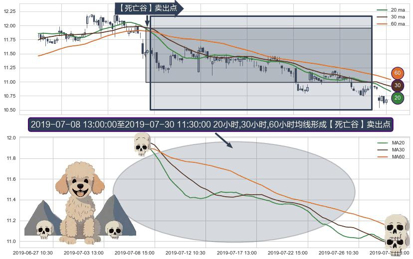 形态多维评估: ⚀ 2019-07-08 14:00:00-小时至2019-07-30 11:30:00-小时显现 20小时-30小时-60小时均线 【死亡谷】卖出点 看空信号,后市看跌,卖出