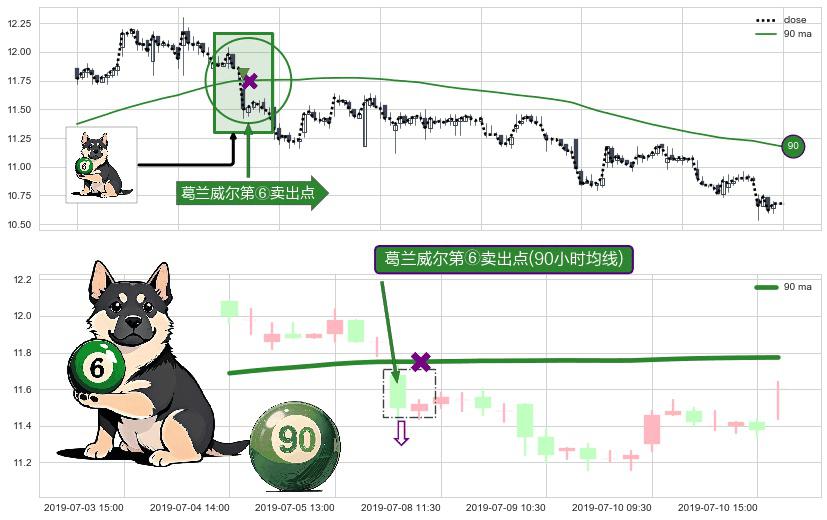 形态多维评估: ⚀ 2019-07-08 09:30:00-小时显现 葛兰威尔均线 90小时均线 第⑥卖出点 走势反转见顶信号,后市看跌,卖出信号