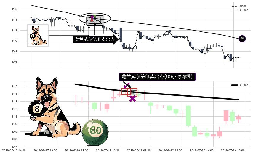 形态多维评估: ⚀ 2019-07-19 13:00:00-小时显现 葛兰威尔均线 60小时均线 第⑧卖出点 下降趋势的中继信号,后市看跌,卖出信号
