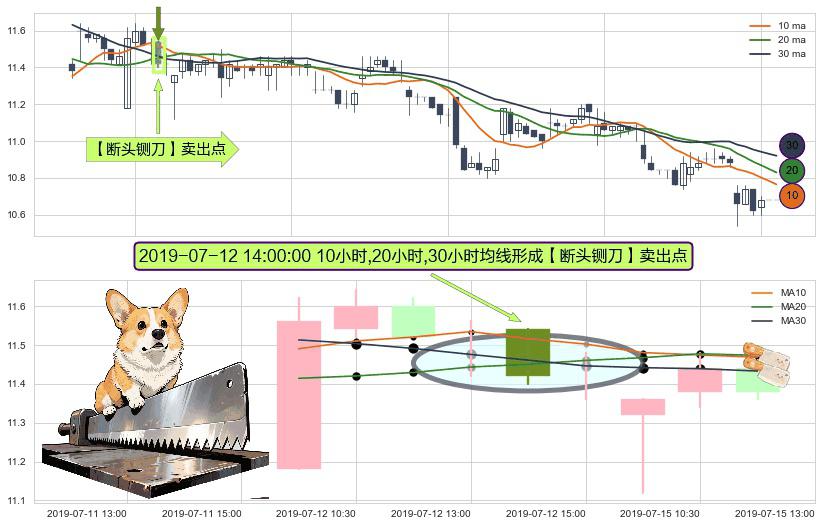 形态多维评估: ⚀ 2019-07-12 14:00:00小时显现 10小时-20小时-30小时均线 【断头铡刀】卖出点 看空信号,后市看跌,卖出