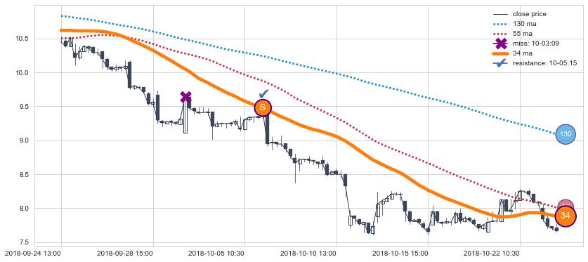 下跌趋势04-18 15:00-06-06 15:00,均线55确认关键阻力5处