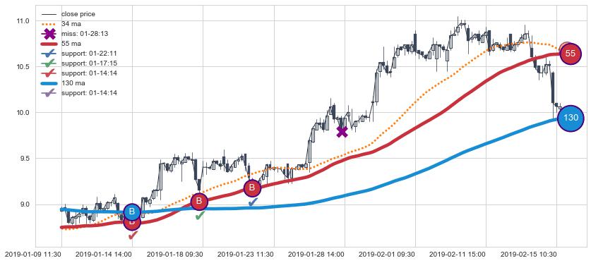 上涨趋势06-06 15:00-07-05 13:00,均线130, 34, 55确认关键支撑3处