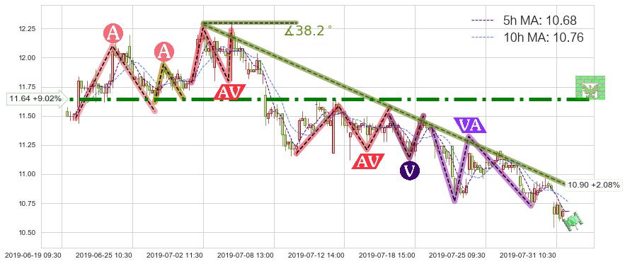 从2019-07-02 11:30至2019-07-31 15:00,共包含130个小时,阶段股价下跌-12.96%,阶段股价变动位移路程比: 1 : 4,下跌趋势角度: 38.2