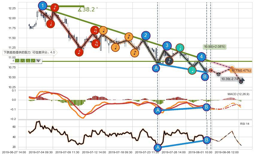 ➢ 预测:2019-08-06 14:00,【继续下探】稳定目前下跌趋势的前提下,预测价格:10.39