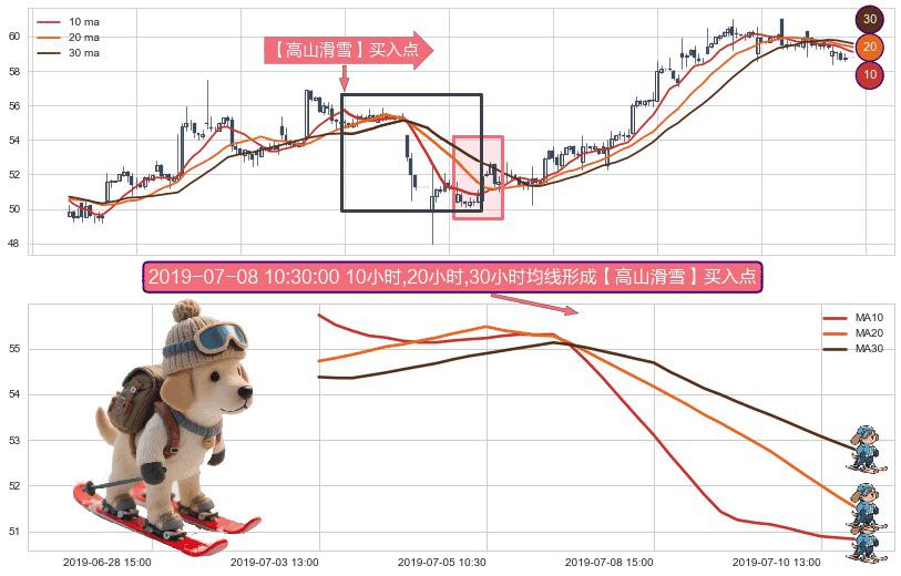 ⚀ 2019-07-03 13:00:00小时-2019-07-10 15:00:00小时显现 10小时-20小时-30小时均线 【高山滑雪】买入点 看多信号,后市看涨,买入