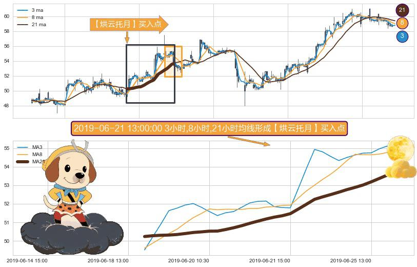 ⚀ 2019-06-18 15:00:00小时-2019-06-26 09:30:00小时显现 3小时-8小时-21小时均线 【烘云托月】买入点 看多信号,后市看涨,买入