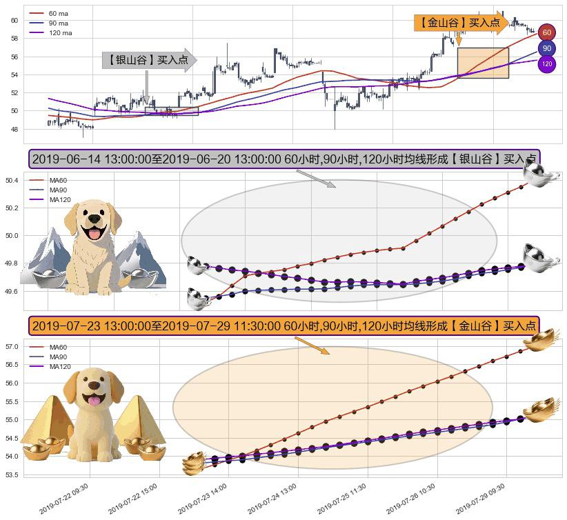 ⚃ 2019-07-23 14:00:00-小时至2019-07-29 11:30:00-小时显现 60小时-90小时-120小时均线 【金山谷】买入点 其再次确认了买入信号,可靠性更强,买入