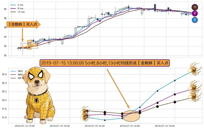 ⚀ 2019-07-15 13:00:00小时显现 5小时-8小时-13小时均线 【金蜘蛛】买入点 看多信号,后市看涨,买入