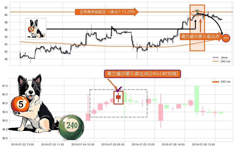 ⚀ 2019-07-24 15:00:00-小时显现 葛兰威尔均线 240小时均线 第⑤卖出点 上升趋势均值回复的短线回落信号,后市看跌,卖出信号