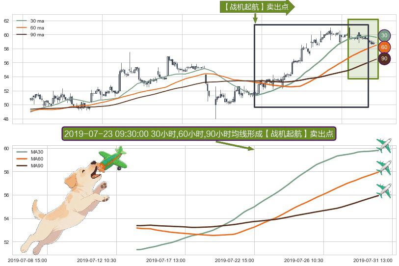⚀ 2019-07-15 10:30:00小时-2019-07-30 15:00:00小时显现 30小时-60小时-90小时均线 【战机起航】卖出点 看空信号,后市看跌,卖出