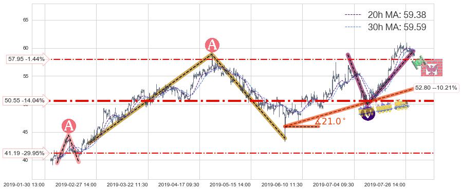 ♘ 支撑价格位57.95,可信任强度42.33%,距离最后交易2019-07-31 15:00形成的收盘价格58.80相差 -1.44%