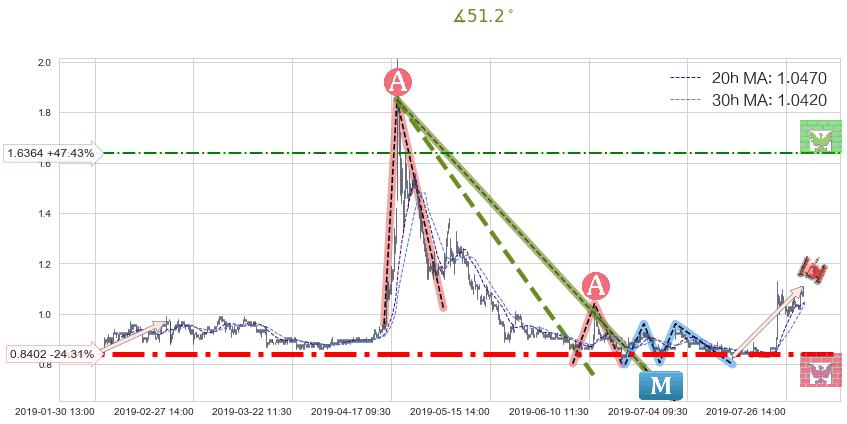 从2019-06-17 15:00至2019-07-15 14:00,共包含114个小时,阶段股价上涨2.12%,阶段股价变动位移路程比: 1 : 42