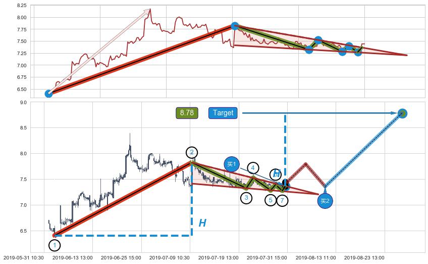 从2019-06-27 13:00至2019-07-12 14:00,共包含62个小时,阶段股价下跌-6.75%,阶段股价变动位移路程比: 1 : 5