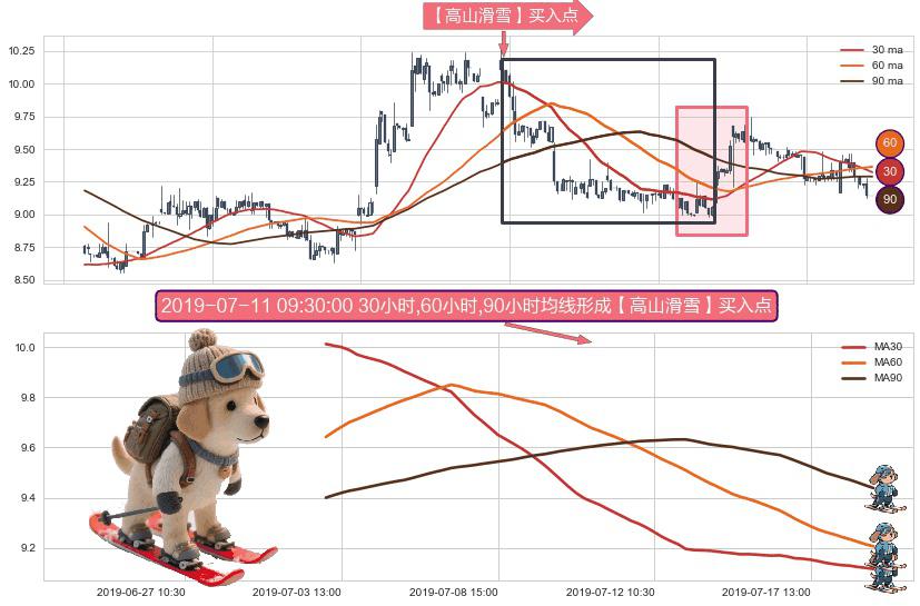 ⚀ 2019-07-03 10:30:00小时-2019-07-18 15:00:00小时显现 30小时-60小时-90小时均线 【高山滑雪】买入点 看多信号,后市看涨,买入