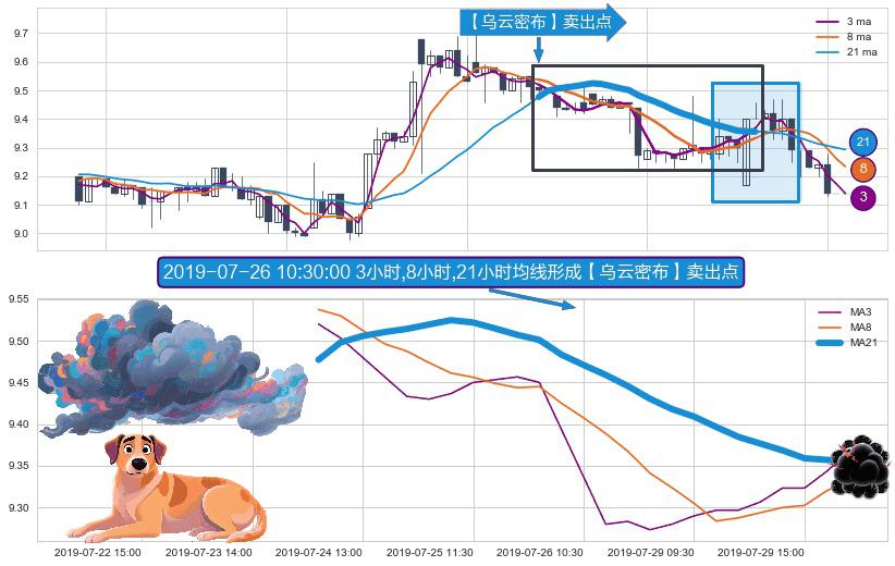 ⚀ 2019-07-24 10:30:00小时-2019-07-30 10:30:00小时显现 3小时-8小时-21小时均线 【乌云密布】卖出点 看空信号,后市看跌,卖出