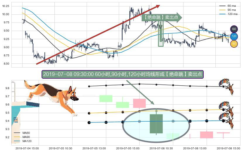 ⚀ 2019-07-08 09:30:00小时显现 60小时-90小时-120小时均线 【绝命跳】卖出点 看空信号,后市看跌,卖出