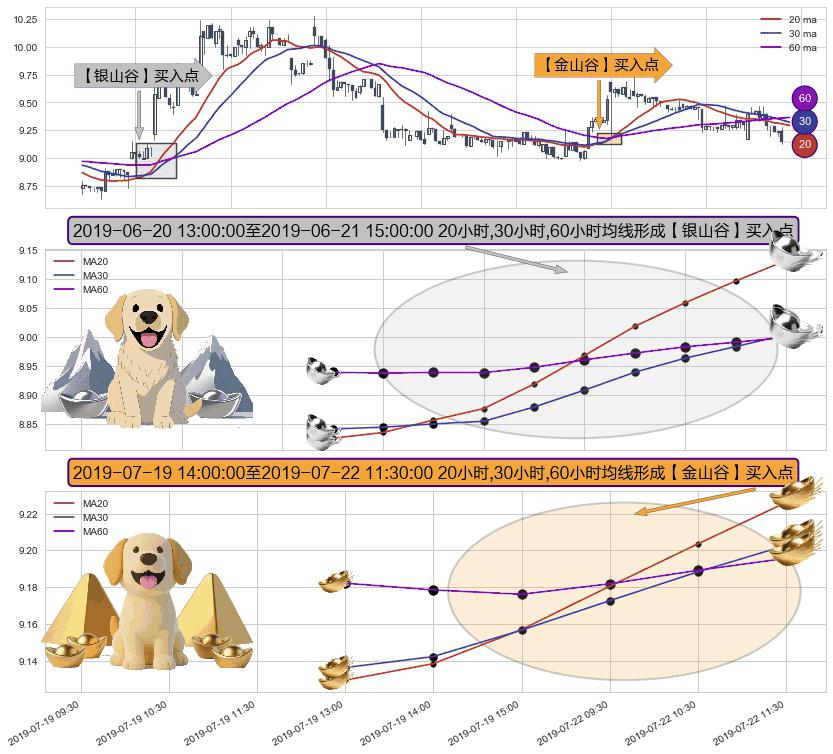⚀ 2019-07-19 15:00:00-小时至2019-07-22 11:30:00-小时显现 20小时-30小时-60小时均线 【金山谷】买入点 其再次确认了买入信号,可靠性更强,买入