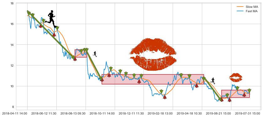 07-23 09:30至08-14 15:00 慢线与快线多次接触,存在上下穿越,有缠绕