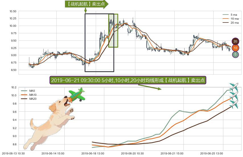 ⚀ 2019-06-18 09:30:00小时-2019-06-25 15:00:00小时显现 5小时-10小时-20小时均线 【战机起航】卖出点 看空信号,后市看跌,卖出