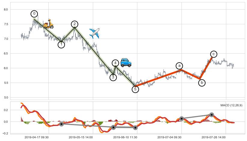 从2019-07-12 15:00至2019-07-31 15:00,共包含79个小时,阶段股价上涨8.47%,阶段股价变动位移路程比: 1 : 5