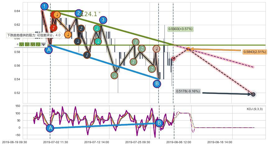 ♘ 在最后的下跌阶段2019-06-24 09:30至2019-07-29 14:00,存在 持续未破位的阻力位 ,阻力价格0.5903,可信任强度82.27%,其距离最后价格0.5700相差 +3.57%