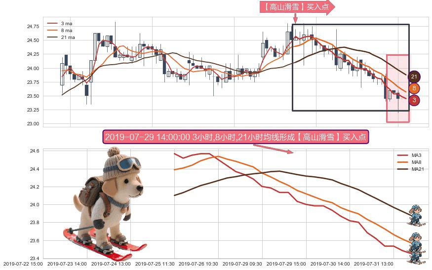 ⚀ 2019-07-25 11:30:00小时-2019-07-31 15:00:00小时显现 3小时-8小时-21小时均线 【高山滑雪】买入点 看多信号,后市看涨,买入