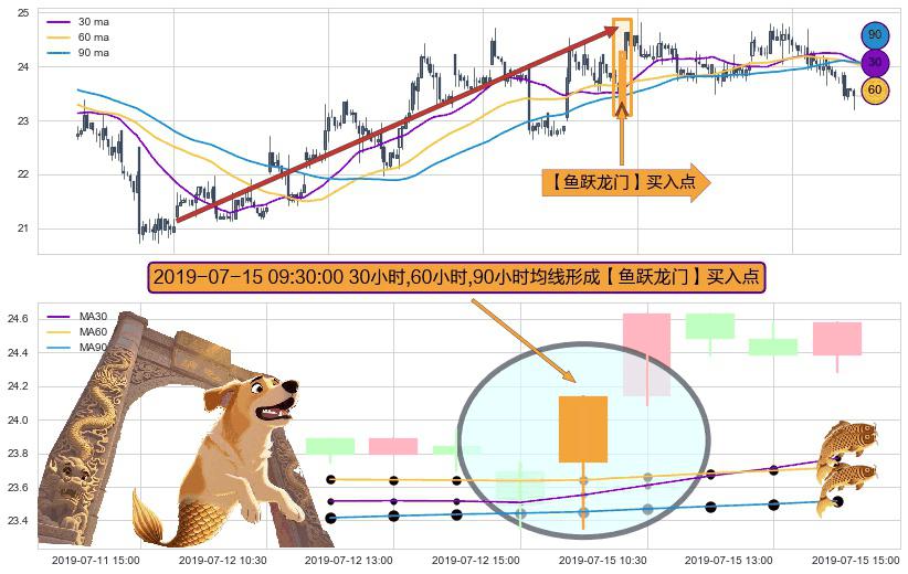 ⚀ 2019-07-15 09:30:00小时显现 30小时-60小时-90小时均线 【鱼跃龙门】买入点 看多信号,后市看涨,买入