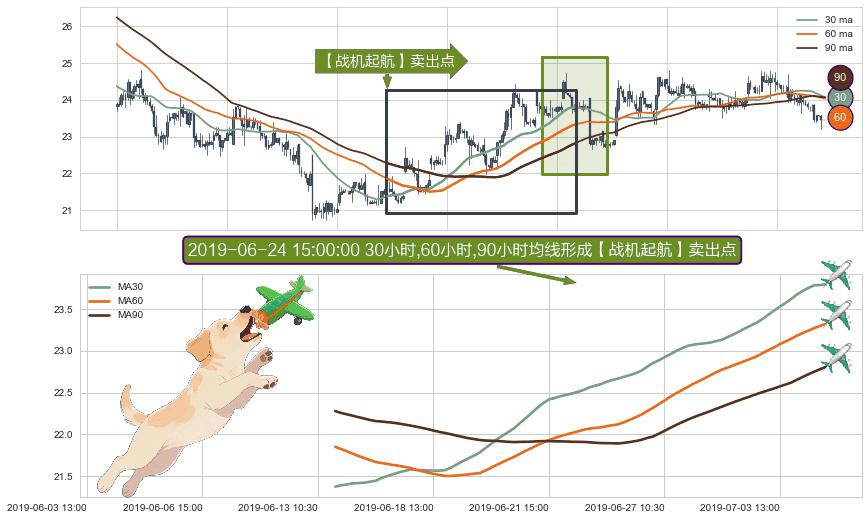 ⚀ 2019-06-13 14:00:00小时-2019-07-04 15:00:00小时显现 30小时-60小时-90小时均线 【战机起航】卖出点 看空信号,后市看跌,卖出