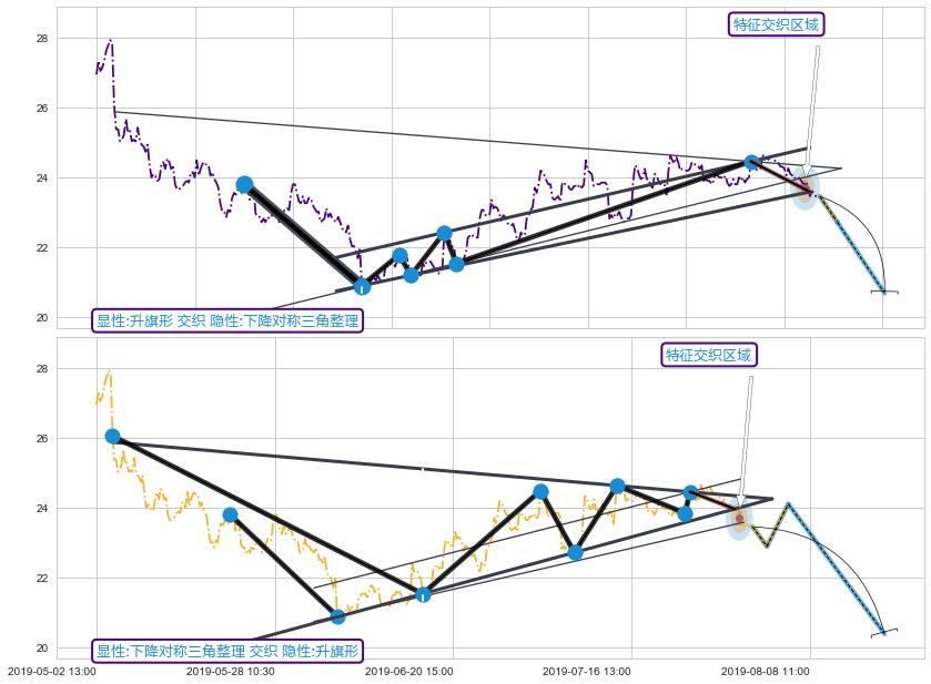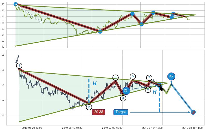 ➣ 【已确认突破】下降【对称】三角形整理 起点:05-06:09,突破点:07-30:10,形态共350交易小时
