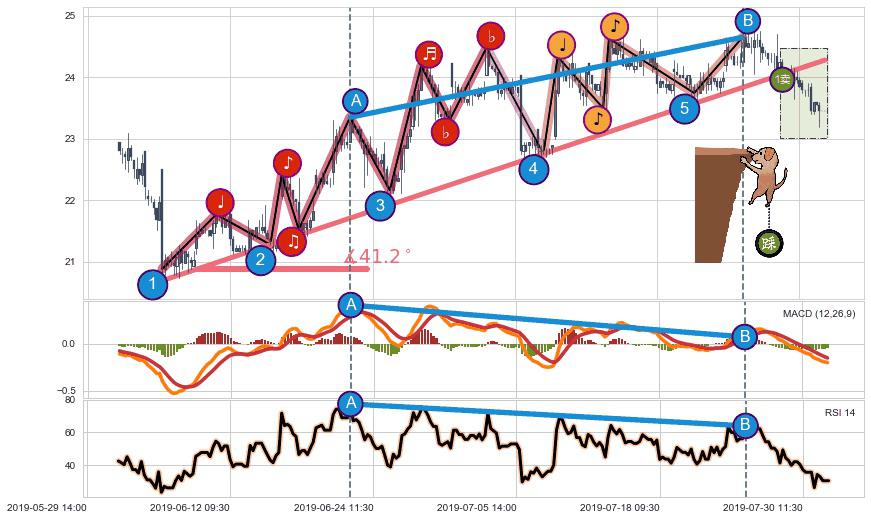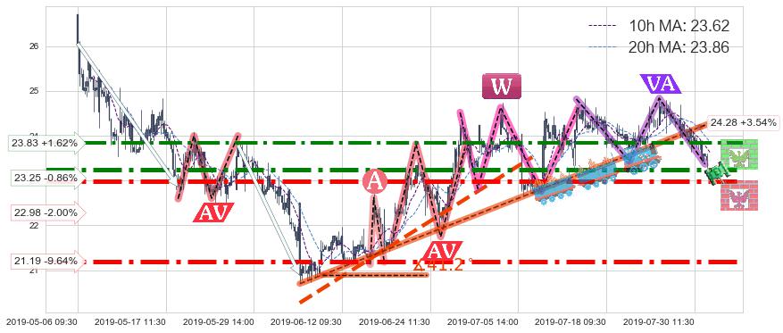 ✂️ 2019-06-05 09:30-2019-07-30 15:00上升趋势存在反转[风险],其原上升趋势的支撑位(24.28)已破位[强阻力信号],原上升趋势角度: 41.2˚