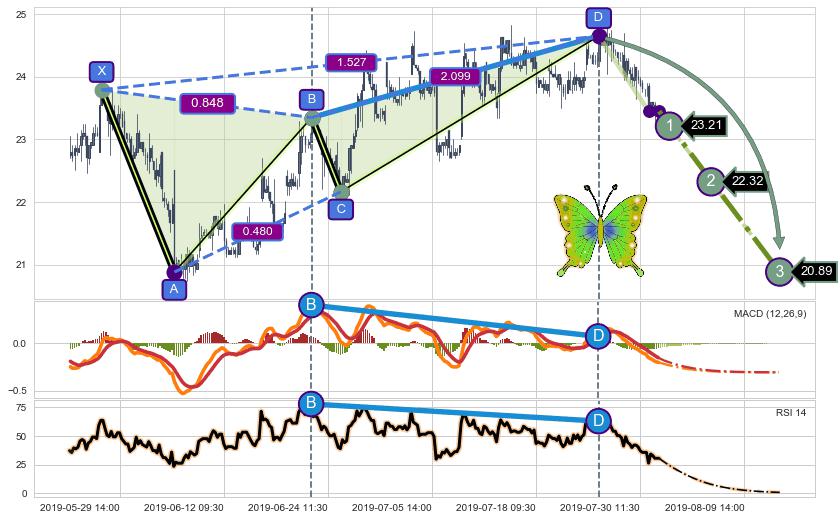 ➣ 已完成【蝴蝶】形态起点X: 05-28:10, 终点D: 07-25:09, 共240交易小时