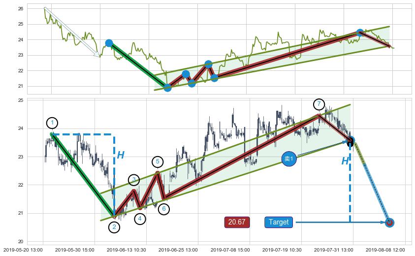 从2019-06-27 10:30至2019-07-15 10:30,共包含67个小时,阶段股价上涨2.22%,阶段股价变动位移路程比: 1 : 20