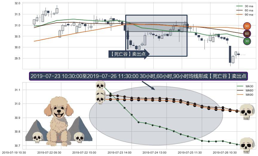 形态多维评估: ⚀ 2019-07-23 11:30:00-小时至2019-07-26 11:30:00-小时显现 30小时-60小时-90小时均线 【死亡谷】卖出点 看空信号,后市看跌,卖出