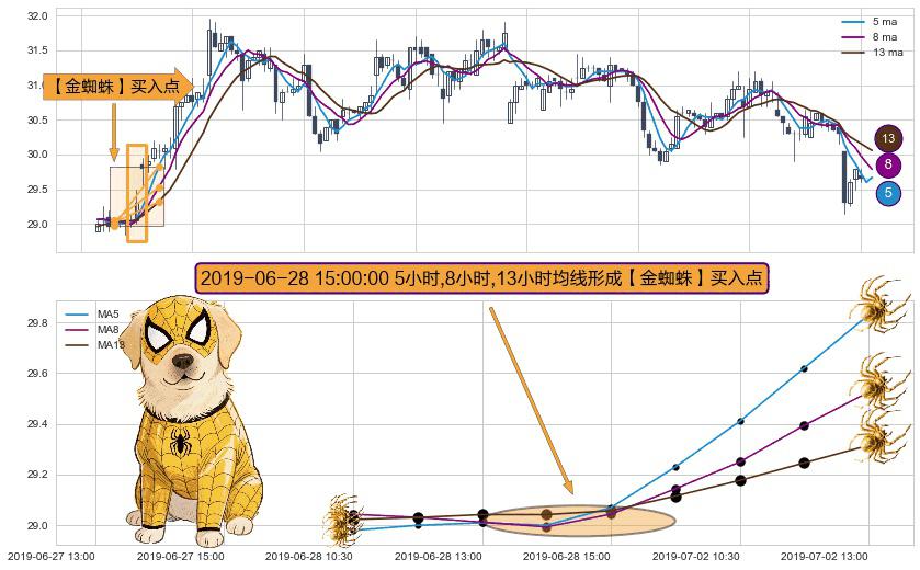 形态多维评估: ⚀ 2019-06-28 15:00:00小时显现 5小时-8小时-13小时均线 【金蜘蛛】买入点 看多信号,后市看涨,买入