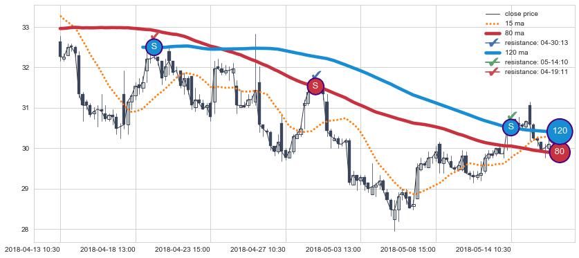 下跌趋势04-13 10:30-05-15 15:00,均线80, 120确认关键阻力3处