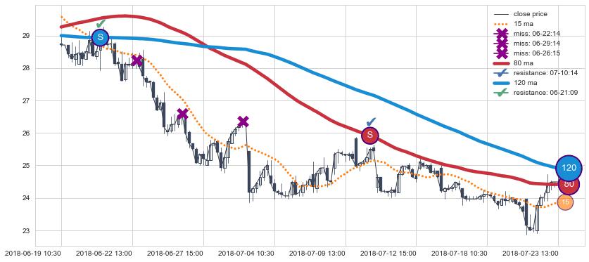 下跌趋势06-19 10:30-07-23 13:00,均线80, 120确认关键阻力2处