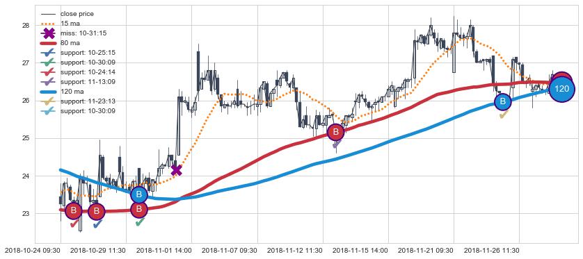 上涨趋势10-24 09:30-11-28 09:30,均线80, 120确认关键支撑5处