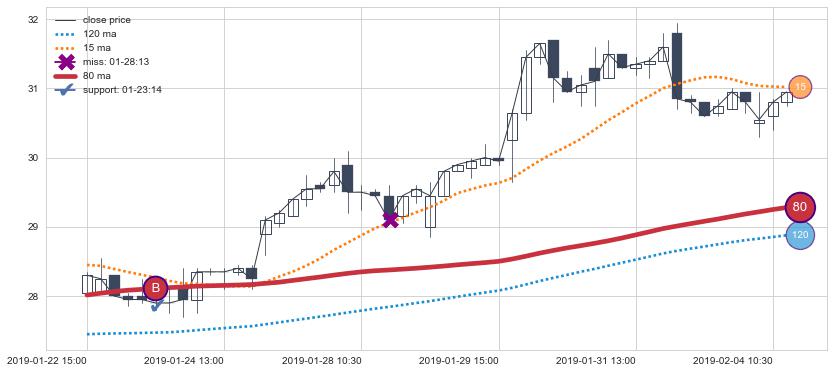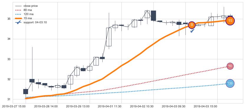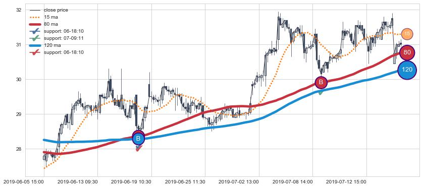 上涨趋势06-05 15:00-07-17 13:00,均线80, 120确认关键支撑2处