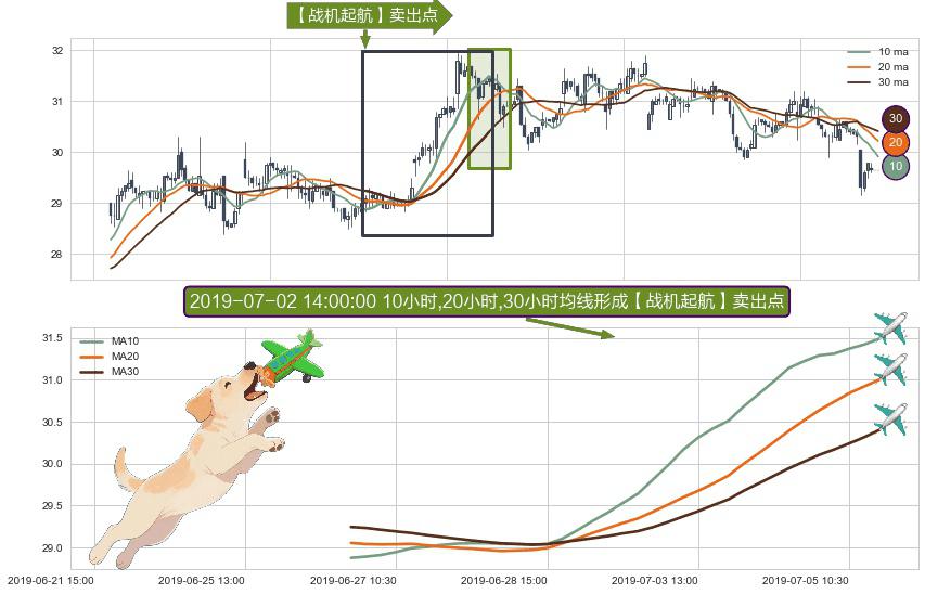 形态多维评估: ⚀ 2019-06-26 14:00:00小时-2019-07-05 13:00:00小时显现 10小时-20小时-30小时均线 【战机起航】卖出点 看空信号,后市看跌,卖出